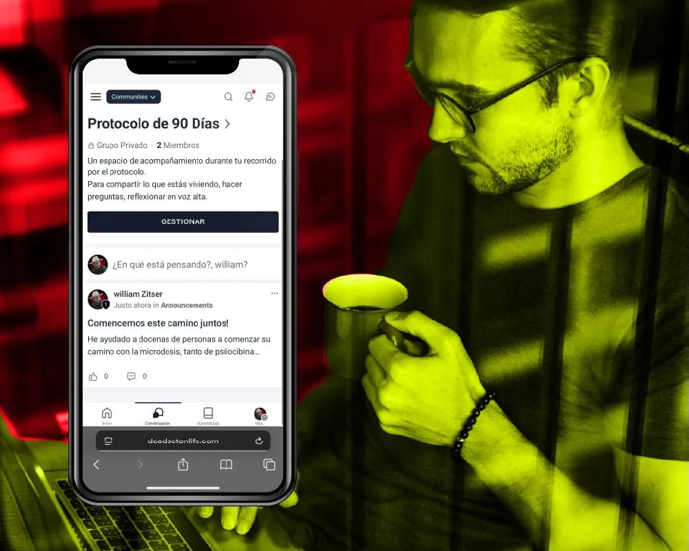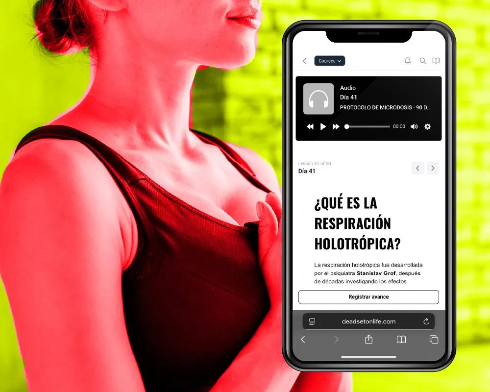 Acceso al Protocolo de Microdosis de 90 Días, a todos los programas futuros de Dead Set On Life + comunidad privada, y a dos sesiones grupales en vivo cada mes (integración + breathwork) – mientras dure el acceso.